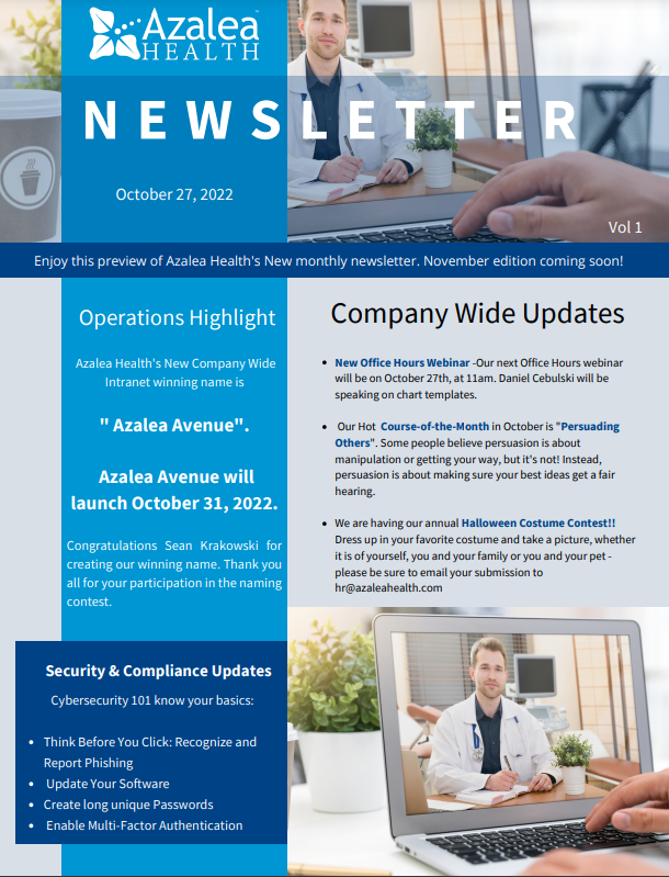 Result: The result was a highly successful project that significantly improved company-wide communication. The newsletter achieved an impressive 78% engagement rate within the initial 24 hours of its launch, indicating immediate positive reception and impact. The project successfully addressed the communication challenge at Azalea Health, providing a centralized and visually engaging platform for department updates and fostering effective and efficient internal communication.
